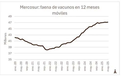 La faena de vacunos en los países del Mercosur en mayo se estima en cerca de 4,1 millones de cabezas, la más abultada desde agosto de 2024. Sin embargo, observando la tendencia anualizada es claro que en los últimos meses la faena ha dejado de crecer y seguramente tome una trayectoria moderadamente descendente a partir del segundo semestre de este año.