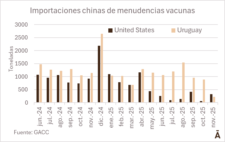 El drástico descenso del ingreso de menudencias vacunas provenientes de Uruguay hizo que Estados Unidos, aunque su volumen no fue grande, se convirtiera en el principal proveedor de estos productos al mercado chino en noviembre.