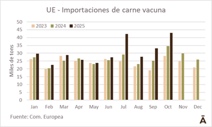 Las necesidades de importación de carne vacuna por parte de los países miembros de la Unión Europea (UE) se reflejan tanto en los volúmenes como en el valor medio de importación.