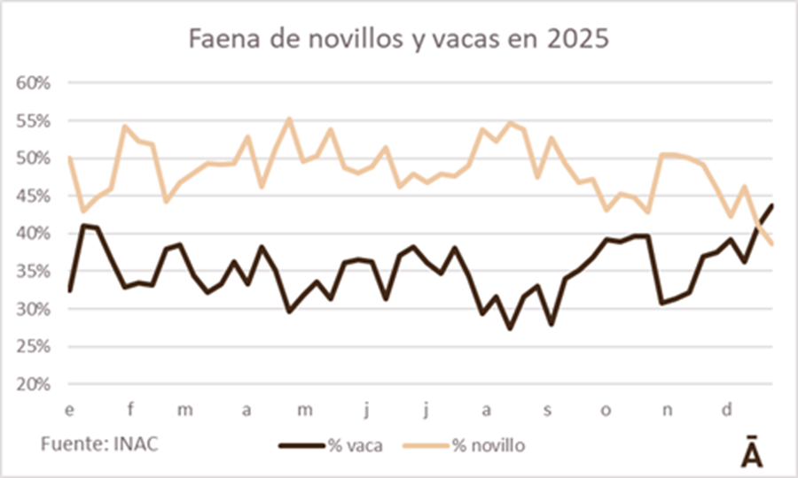 El año culmina con la mayor participación de vacas dentro del total faenado. INAC informó que en la semana al 27 de diciembre ingresaron a planta 32.034 vacunos, con un lógico descenso respecto a las semanas anteriores.
