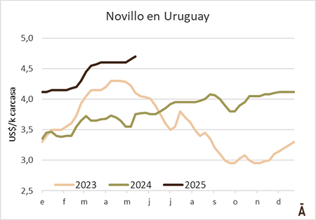 A juicio del operador Carlos de Freitas, en la última semana se evidenció un “retiro de la oferta” en el mercado spot de la hacienda, con una demanda “pujante” que busca “captar” lo poco que se ofrece. “Esto está llevando a una nueva semana de firmeza para el gordo”, aseguró. El intermediario manejó valores de referencia para los mejores novillos, “especiales de punta”, en un eje de US$ 4,80-4,85 por kg carcasa, aunque también se hacen negocios por animales con menor terminación en un rango de US$ 4,65-4,70.