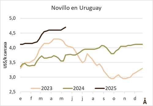 Fue otra semana de firmeza para el mercado de hacienda en la semana cerrada al 17 de mayo. De acuerdo a la reunión de precios de la ACG de este lunes, los novillos hicieron un promedio de US$ 4,65 por kg a la carne (+4 cents), las vacas gordas de US$ 4,36 (+3 cents), y las vaquillonas de US$ 4,51 (+4 cents). “Buena demanda; entradas más ágiles. Mercado firme”, dijeron los consignatarios en su comentario. Los novillos especiales de exportación se negociaron a una media de US$ 4,71 por kg a la carne (+4 cents).
