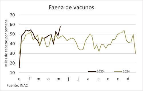 La faena de vacunos en la semana al 10 de mayo ascendió a 57.717 animales, 9 mil más que en la anterior y la más alta desde la segunda semana de noviembre de 2023, 18 meses atrás.