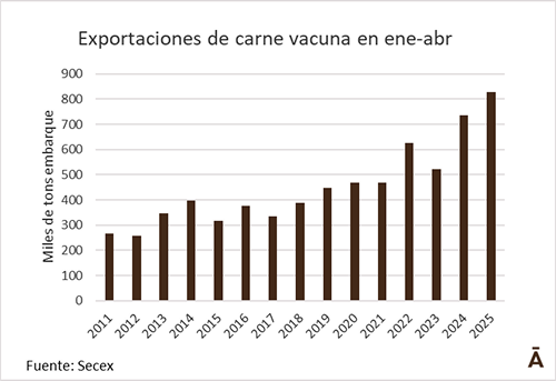 Brasil exportó 241,6 mil toneladas de carne vacuna en abril a un valor medio de US$/t 5.030, de acuerdo con datos divulgados por la Secretaría de Comercio Exterior (Secex), volumen récord para el cuarto mes del año y con un valor medio de exportación en alza. Con ello, en los primeros cuatro meses del año las exportaciones acumulan 828 mil toneladas, 93 mil tons más que en el mismo período de 2024 y un máximo histórico para el período.