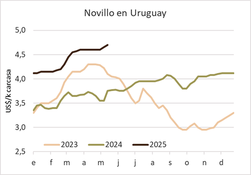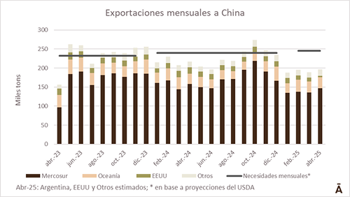 Se estima que se embarcaron a China en abril algo menos de 200 mil toneladas de carne vacuna, un volumen similar al de los primeros tres meses del año y claramente por debajo del promedio de 250 mil toneladas mensuales de los últimos tres meses de 2024.