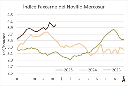 El valor medio del ganado a faena en la región dejó atrás dos semanas de corrección a la baja y subió gracias, fundamentalmente, a la recuperación de los precios en Argentina. El Índice Faxcarne del Novillo Mercosur aumentó 8 cents en la semana a US$ 4,00 el kilo carcasa.