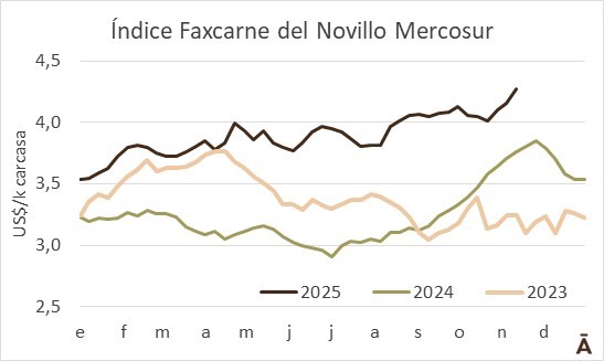 Con aumentos significativos en Brasil y Argentina, el valor medio del novillo en los países del Mercosur pegó un salto esta última semana al nivel más alto desde mayo de 2022. El Índice WBR del Novillo Mercosur subió 12 cents en la semana a US$ 4,27 el kilo carcasa.