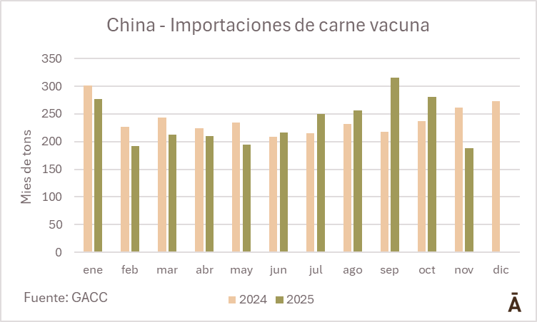 China importó solamente 187.468 toneladas de carne vacuna en noviembre, lejos por debajo de las 281 mil tons de octubre y 316 mil de setiembre.