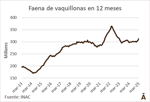 La escasez de novillos y los altos precios del ganado a faena están haciendo crecer la actividad industrial con vaquillonas. En lo que va del año la faena de vacunos creció 3,5% anual, con un moderado aumento en la cantidad de novillos y una disminución, también moderada, de las vacas. Sin embargo, la faena de vaquillonas creció un consistente 18,5% anual en lo que va de 2025 hasta el 19 de abril.