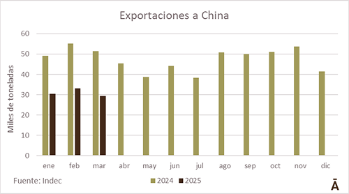 Las exportaciones de carne bovina refrigerada y congelada alcanzaron en marzo 43.379 toneladas (peso producto), lo que representa un 17,2% menos que el mes previo, 36,1% menos que en marzo de 2024, y el volumen más bajo desde enero de 2022. En valor, los despachos de marzo totalizaron US$ 205,9 millones, lo que marca una caída tanto intermensual como interanual de 20,1%. El precio promedio en marzo fue de US$ 4.747 por tonelada, 3,5% inferior al de febrero previo, pero 25,1% mayor que el de marzo de 2024.