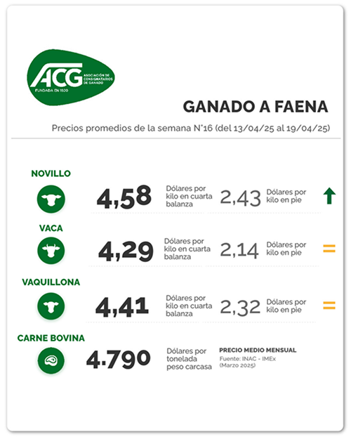 Los precios de la hacienda se mantuvieron tonificados en la semana de Pascuas. De acuerdo a la reunión de precios de la ACG de este lunes, “con menos días de faena, continúa la demanda sostenida; mercado estable”. Así, los novillos gordos se negociaron a US$ 4,58 por kg carcasa durante la semana al 19 de abril (+1 cent), mientras que las vacas gordas a US$ 4,29 y las vaquillonas a US$ 4,41 por kg a la carne se mantuvieron sin cambios respecto a siete días atrás.