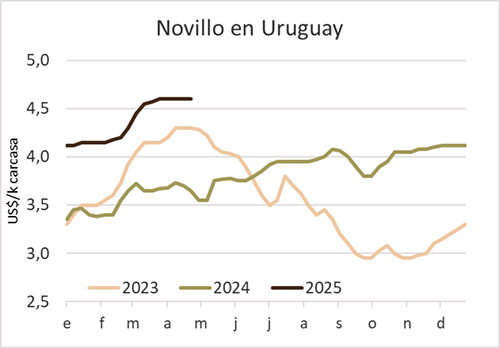 Los novillos especiales de pradera se mantienen sobre una base de US$ 4,60 el kilo. Se da la posibilidad de negocios a US$ 4,65-4,70 el kilo siempre que el lote se encuentre en la mitad sur del país o que no se establezca una fecha de entrada a planta, pudiendo darse el caso de que la carga se termine concretando varias semanas después.