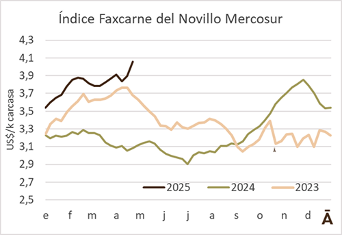 El Índice Faxcarne del Novillo Mercosur subió 17 cents en la semana a US$ 4,06 el kilo carcasa, acumulando un aumento de 22 cents en las dos últimas semanas.