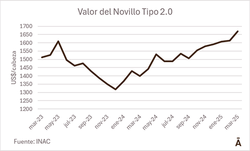 El Instituto Nacional de Carnes (INAC) dio a conocer su informe mensual del indicador del Novillo Tipo 2.0, correspondiente al mes de marzo de 2025, donde se muestra un nuevo incremento mensual del indicador, impulsado por subas tanto del mercado internacional como local.
