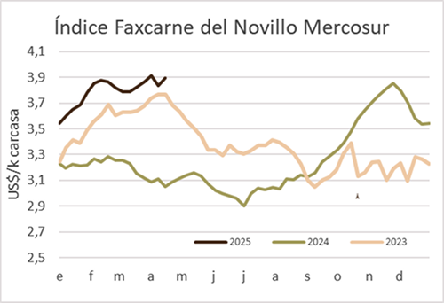 Luego del impasse de la semana pasada, el valor medio del novillo en el Mercosur volvió a subir. El Índice Faxcarne del Novillo Mercosur recuperó 5 cents en la semana a US$ 3,89 el kilo carcasa.