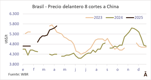 Los precios de importación en China mantuvieron su senda alcista pese a la ola de pesimismo bursátil y de perspectivas económicas que trajo el efecto aranceles de Trump. Fuentes del mercado de importación de China manejaron negocios a World Beef Report (WBR) por delantero 8 cortes desde Brasil a US$/t 5.700 CFR, en un escenario donde los stocks de cortes del delantero todavía son altos, aunque no ocurre lo mismo con los cortes de la rueda, que “son bajos”, según el informante. En tanto, un bróker indicó que había plantas brasileñas que pasaban bid de US$/t 6.000-6.100 para el delantero.