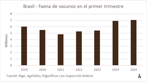 La expectativa de contracción de la oferta de vacunos a faena en Brasil para este año no se cumplió en el primer trimestre, aunque es casi un hecho que lo hará más adelante. La faena de vacunos en frigoríficos con inspección federal (SIF), que son los habilitados a exportar, sumó 7,05 millones de cabezas en los tres primeros meses del año, cifra que nunca había sido alcanzada.