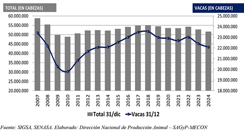 El rodeo vacuno en Argentina a fin de 2024 bajó por segundo año consecutivo a 51,63 millones de cabezas, unos 1,2 millones menos (-2,2%) respecto al año anterior, informó el Ministerio de Economía de la República Argentina.