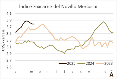 La tendencia a la baja que dominó en las anteriores tres semanas para el valor medio del novillo en el Mercosur quedó atrás. El Índice Faxcarne del Novillo Mercosur recuperó 1 cent a US$ 3,79 el kilo carcasa, favorecido por el aumento de las referencias en Uruguay y por la valorización del tipo de cambio en Brasil.
