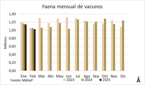 Tal como había ocurrido en enero, la faena argentina de febrero volvió a descender tanto intermensual como interanualmente, y fue la más baja en tres años, desde febrero de 2022, según datos oficiales publicados por la Secretaría de Agricultura. En el segundo mes de 2025 se procesaron 1,025 millones de bovinos, lo que implica un retroceso de 10,5% respecto de enero (que ya había retrocedido 8,1% contra diciembre), y una baja de 2,8% en relación con febrero de 2024.