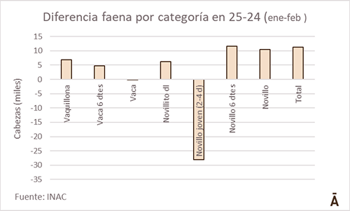 La faena de vacunos en los dos primeros meses del año aumentó y, sin embargo, las dos categorías que contribuyen con más cabezas al total (novillos 2-4 dientes y vacas de refugo) disminuyeron. En el último año y medio se ha dado un aumento en la edad media de faena de los novillos, ya que la disminución de los de 2-4 dientes vino de la mano de un aumento de la faena de animales de más edad. Sin embargo, esto no se transformará en una tendencia y se revertirá de forma relativamente rápida.