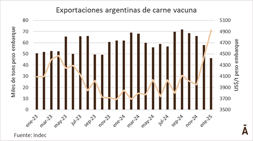 Las exportaciones argentinas de carne vacuna registraron una fuerte contracción en enero de 2025, de acuerdo con datos del INDEC. Con cerca de 46.200 toneladas (peso producto) despachadas, por US$ 227,7 millones, la caída respecto de diciembre de 2024 fue de 20,1% en volumen y 11,1% en valor. En tanto, respecto del primer mes de 2024, la contracción fue de 25,4% en volumen y de 4,4% en valor. Se trató del menor volumen mensual en tres años, desde enero de 2022.