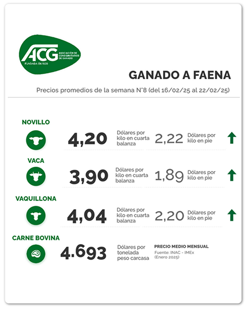 Los precios del ganado gordo con destino a faena se afirmaron con fuerza. De acuerdo a la reunión de precios de este lunes de la ACG, en la semana cerrada al 22 de febrero, los novillos se negociaron en promedio a US$ 4,20 por kg carcasa (+7 cents), las vacas gordas a US$ 3,90 (+5 cents) y las vaquillonas a US$ 4,04 (+5 cents). “Finalizando la faena de ganado de corral, se acentúa la demanda por ganado de campo; mercado firme”, destacó la ACG en su comentario.