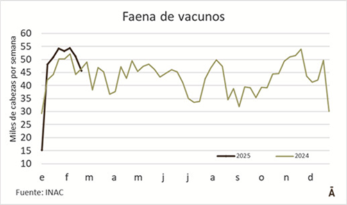 El paro de los trabajadores de la industria frigorífica el pasado jueves y la finalización de la ventana de cuota 481 impactaron en el ritmo de actividad de la industria frigorífica. INAC informó que en la semana al 22 de febrero se faenaron 45.658 vacunos, 11% menos que en la anterior y la menor cantidad desde la primera semana del año.