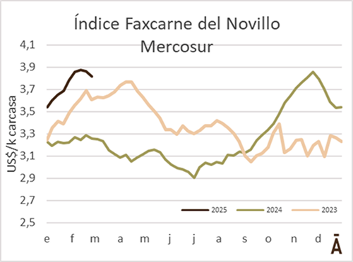 El valor medio del ganado a faena en la región bajó por segunda semana consecutiva. El Índice Faxcarne del Novillo Mercosur perdió 4 cents en la semana a US$ 3,82 el kilo carcasa, presionado fundamentalmente por las bajas de las referencias brasileñas.