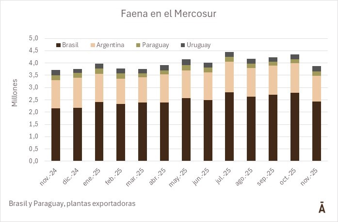 La faena de vacunos en noviembre comenzó a sentir la disminución de la oferta, con bajas en Brasil y Argentina, los dos principales productores de la región.