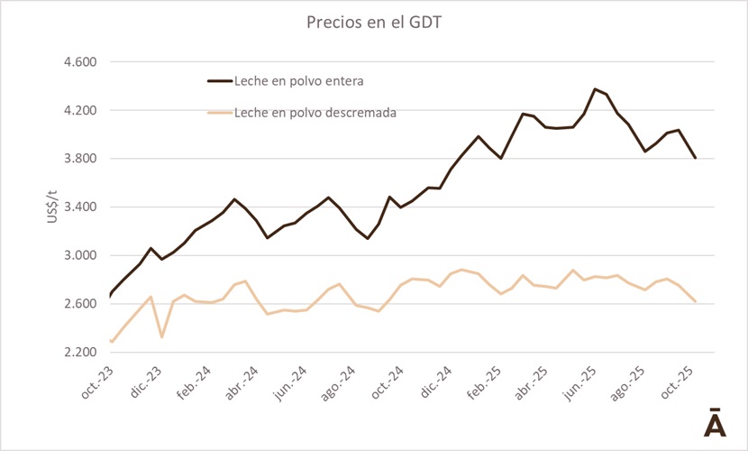 La licitación 389 de la plataforma electrónica Global Dairy Trade (GDT), la primera del mes de octubre cerró con descenso del 1,6%. De esta manera acumuló la cuarta caída consecutiva del indicador, sumando una pérdida de 8,6% en este período (-US$ 370). Las bajas se registran en los principales productos de venta, salvo en el queso Cheddar, que cerró en alza.