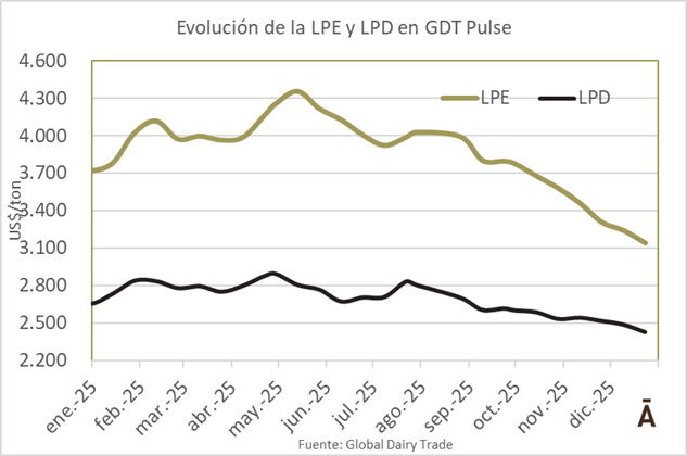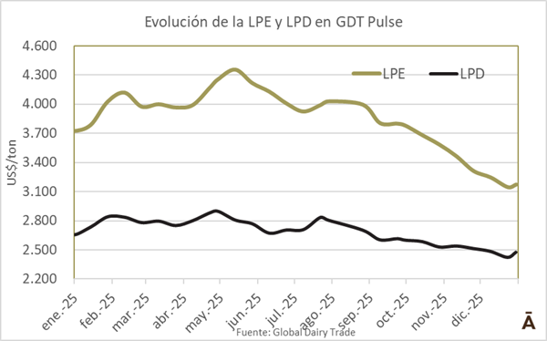 Luego de encadenar una preocupante racha bajista de siete subastas, la última del 2025 cerró con tono alcista en el sistema GDT Pulse de Fonterra.