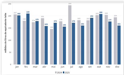 Las importaciones continuaron disminuyendo en diciembre, con una caída del 9% en las importaciones de productos lácteos a Brasil, totalizando 160,5 millones de litros de leche equivalente. En comparación con diciembre de 2024, la disminución fue del 17%.