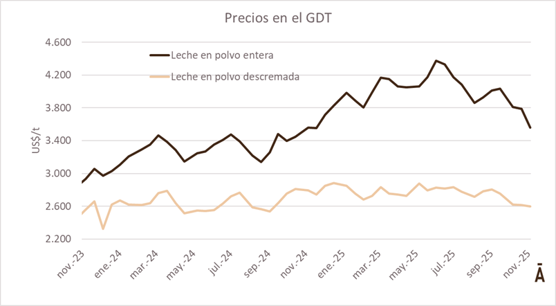 La leche en polvo entera, principal producto de exportación de Uruguay, bajó 2,7% y cerró a US$/t 3.503. Así, este producto acumuló una baja de 19% (casi US$ 900) desde su pico de precio de mediados e mayo (US$/t 4.374).
