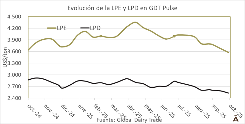 De acuerdo al resultado del remate, el promedio de la leche en polvo entera se ubicó en US$/t 3.580 este martes 28 de octubre, en baja de 2,6% respecto a la subasta del sistema Pulse del pasado 14 octubre.
