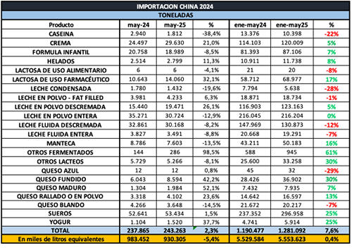 En mayo se dio una suba del 2,3% en el volumen de importaciones de lácteos de China en relación al mismo mes del año anterior, con algunas subas de productos y otras bajas, esto último en productos importantes como leche en polvo entera (-7%). Sin embargo, sueros y leche en polvo descremada aumentaron su volumen. En mayo China importó 243 mil toneladas de productos lácteos versus las 238 mil toneladas de igual mes del año pasado.
