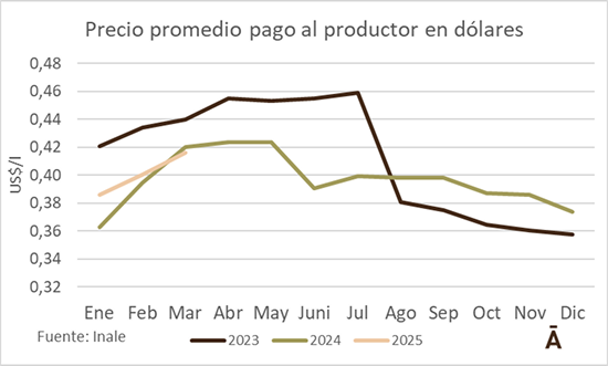 El índice de poder de compra de la leche en pesos en marzo cerró en 105 y subió 5,4% respecto al mismo mes de 2024, con un aumento mayor del índice de precio de leche (+11,9%) acompañado por una menor alza del índice de costos (+6,1%), según el Inale.