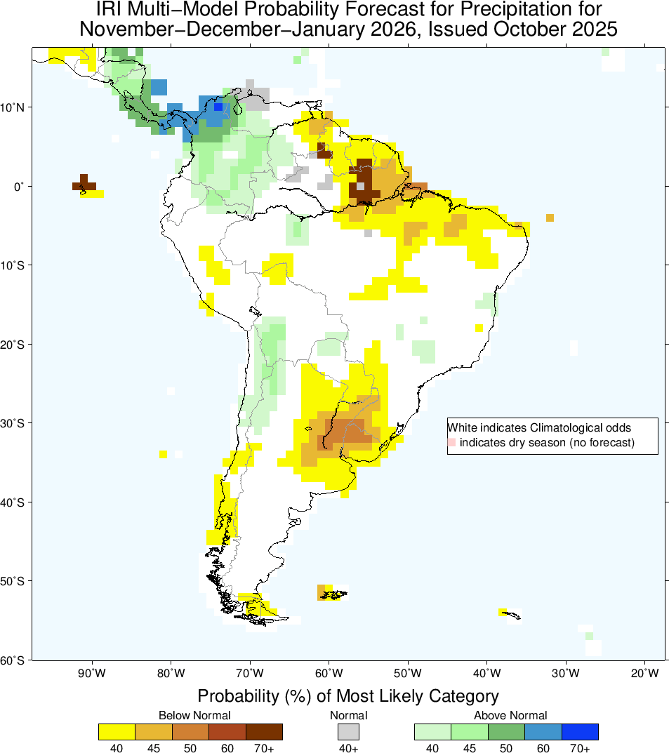 En su último reporte quincenal, el Instituto Internacional de Investigación para el Clima (IRI, Universidad de Columbia) mantuvo la presencia de un evento Niña leve, que persistiría hasta el verano austral. El fenómeno podría traducirse en lluvias por debajo de lo normal en el norte del país y temperaturas por encima de la media en gran parte del territorio.