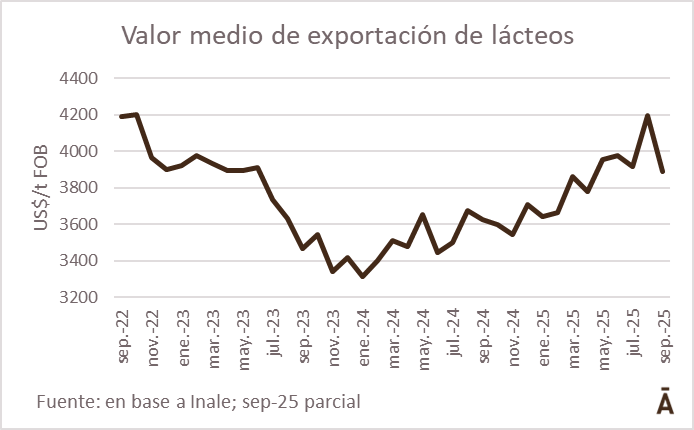 Uruguay aprovechó de buena manera los máximos que se alcanzaron en el mercado internacional de los lácteos. En agosto, de acuerdo con los datos de Aduanas informados por el Instituto Nacional de la Leche (Inale) se embarcaron al exterior 21.687 toneladas de productos lácteos, el mayor volumen desde enero. El valor medio de estos embarques fue de US$/t 4.195, un máximo en casi tres años, desde octubre de 2022.