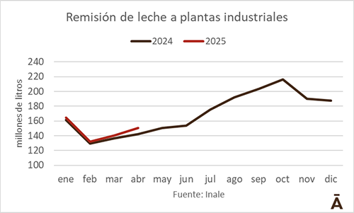 La remisión de leche a las distintas plantas industriales totalizó 151 millones de litros en abril y creció 6% interanual, la mayor tasa mensual en lo que va del año 2025. En el período enero-abril, la remisión sumó 588 millones de litros y se expandió 3%, según el Inale.