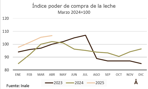 El índice de poder de compra de la leche en pesos, que procesa el Inale, cerró abril con un valor de 107 (marzo 2024=100), un nuevo máximo en lo que va del año e igualando el techo alcanzado en julio de 2023. Respecto a abril del año pasado, el poder de compra de la leche tuvo una mejora 4,6%. El índice de costos de producción de leche en pesos tuvo una suba del 8,6% durante el último año. Sin embargo, esto fue más que compensado por un aumento en el índice del precio de la leche en pesos del 14%.