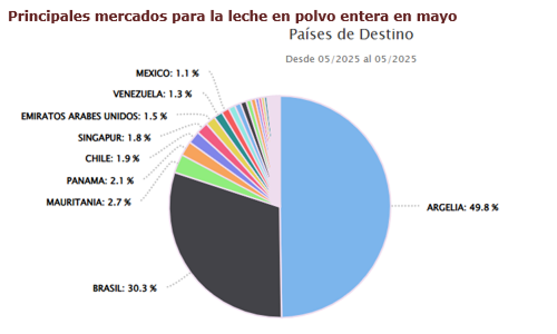 Las solicitudes de exportación de productos lácteos se ubicaron en US$ 66 millones en mayo de 2025, lo que supuso una caída interanual de 10% productor de una reducción del volumen exportado de 20 a 17 mil toneladas.