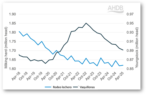 Al 1º de abril de 2025, los últimos datos del BCMS muestran que el stock lechero en Gran Bretaña se situó en 1,62 millones de cabezas, lo que supone una disminución del 0,9 % interanual. Esta es la cifra más baja registrada en abril.