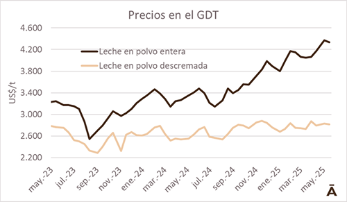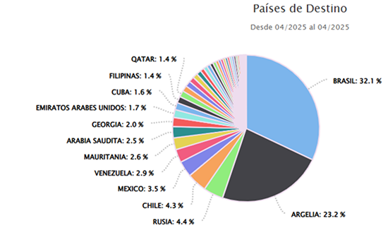Las exportaciones de productos lácteos totalizaron US$ 67,8 millones en abril, unos US$ 10 millones más que igual mes del año pasado. El valor medio de la tonelada de leche en polvo entera fue de US$/t 3.970, con una facturación por casi US$ 41 millones. Argelia fue el principal destino (36%) para la LPE, seguido por Brasil (35%) y Venezuela (4,4%).