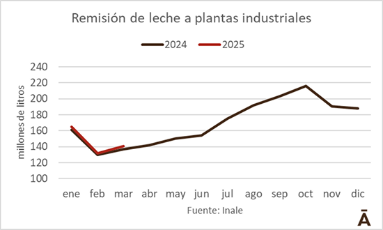 La remisión de leche (preliminar) a las distintas plantas industriales totalizó 140,5 millones de litros en marzo, volumen que fue 2,9% superior a igual mes del año pasado (+4 millones de litros), según el Inale.