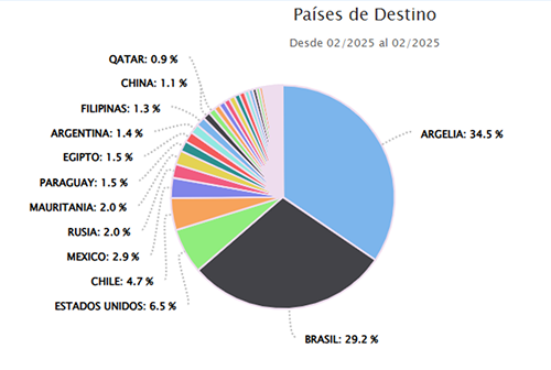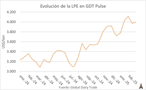De acuerdo a datos aduaneros, las solicitudes de exportación de productos lácteos en febrero de este año totalizaron unas 19.500 toneladas por unos US$ 72 millones. El valor medio de exportación para todos los productos se ubicó US$/t 3.670. En febrero de 2024, Uruguay había exportado unas 15 mil toneladas de productos lácteos a un precio medio de US$/t 3.370, lo que totalizó unos US$ 52 millones.