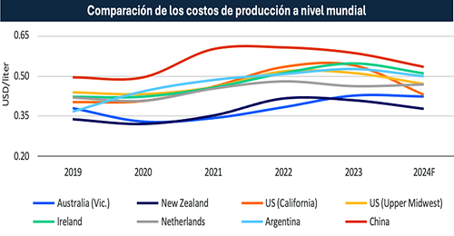 Los productores lecheros de todo el mundo han sentido la presión de unos costos de producción de leche cada vez más altos. En promedio, los costos en ocho regiones (Argentina, Australia, California, China, Irlanda, Nueva Zelanda, los Países Bajos y el Alto Medio Oeste) han aumentado alrededor de US$/litro 0,06 entre 2019 y 2024, es decir un 14%.