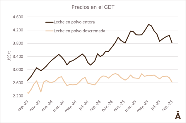 El remate tradicional de GDT de Fonterra mostró una baja promedio de 0,8% para todos los productos con un precio medio de US$/t 4.041 este martes. Fue el segundo descenso consecutivo, aunque bastante más moderado que el -4,3% del pasado 2 de setiembre.
