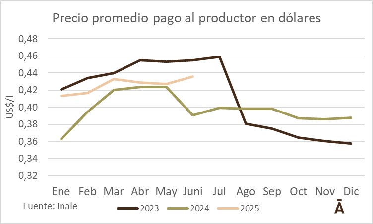 La fuerte depreciación que sufrió el tipo de cambio en junio llevó a que el precio en dólares corrientes que recibieron los tamberos por su remisión de leche a la industria llegara a máximos en el año.