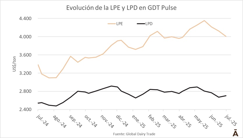 Tras la última venta del mes del sistema GDT Pulse, este martes 29 de julio, el mercado cerró con una nueva suba para la leche en polvo entera, en tanto que la descremada registró un descenso en sus valores. La subasta 85 de Global Dairy Trade (GDT) Pulse, registró una suba del 1,1% para la leche en polvo entera (LPE), que en el acumulado del mes cierra 0,5% sobre la última venta del mes de junio. Por su parte, para la leche en polvo descremada (LPD), Se registró un descenso del1,1% en su valor promedio respecto al pasado martes 22 de julio, en tanto que en el mes subió 3,7%.